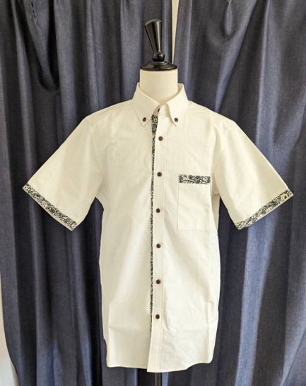 ベースのシャツ生地には弊社のバガス生地を採用し、襟・袖部分に裁断したヘッドレストカバーを使用している。 JTAは空港スタッフの制服にかりゆしシャツを採用しており、 今後バガスをアップサイクルしたかりゆしシャツの制服としての採用を検討いただく。